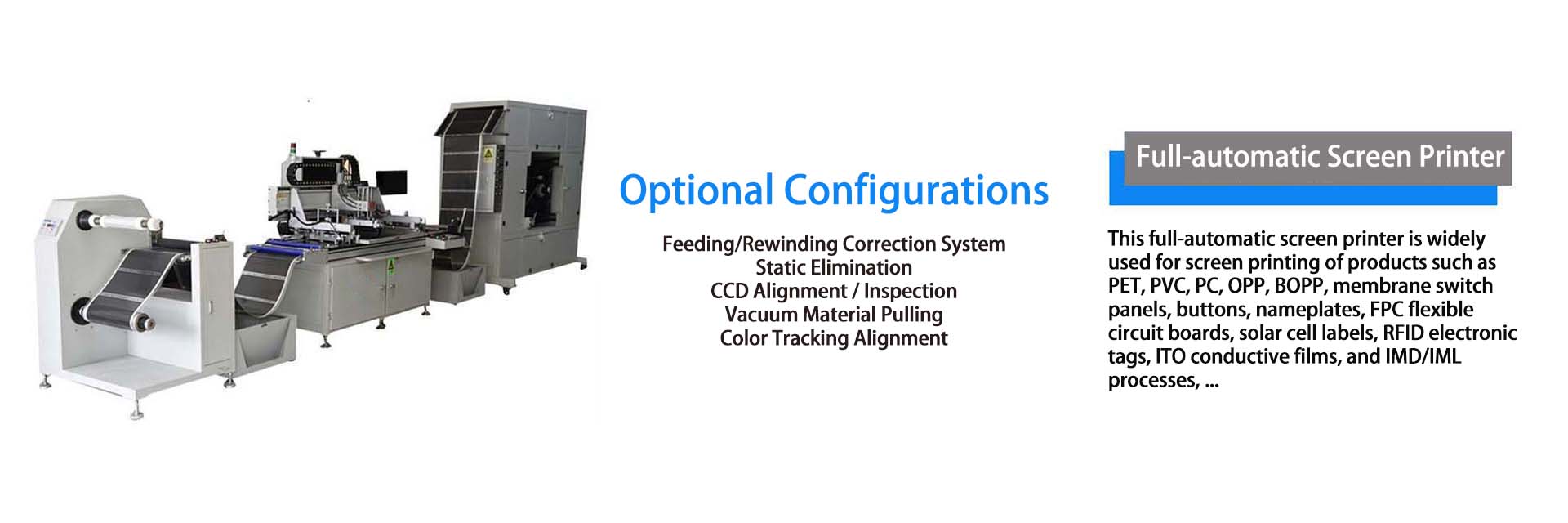 Four-Column Screen PrinterThis full-automatic screen printer is widely used for large-area product printing, including screen printing of products (with width within 1 meter) such as PET, PVC, PC, OPP, BOPP, membrane switch panels, buttons, nameplates, FPC flexible circuit boards, solar cell labels, RFID electronic tags, ITO conductive films, and IMD/IML processes, ...